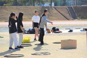 中学生のプログラムでは、ボール集めゲーム、ビンゴリレー、パス移動ゲームを行いました。体だけでなく頭を使い、考えながらプログラムに取り組みました。後半は弓道を見学し、実際に弓を引かせてもらったり、普段できない体験をすることができました。