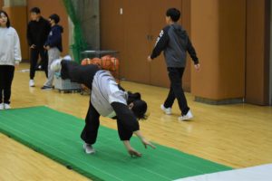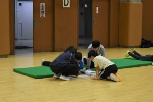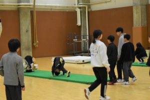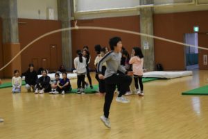 最初に全員でチェックシートを用いて柔軟チェックを行い、続いて小中学生合同でマット運動と大縄とびを中心にプログラムが進められました。マット運動では(前転、後転、開脚前転、側方倒立回転等)さまざまな動きにチャレンジし、きっず達は積極的に取り組みました。大縄跳びでは、男女別でチームを分けて回数を競い、楽しみながらプログラムに取り組みました。